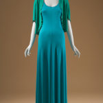 Vera Maxwell was a leading, mid-century American sportswear designer. Prior to her entry into fashion, she was a member of the Metropolitan Opera Ballet between 1919 and 1924. She also worked as a model and began sketching for clothing manufacturers before opening her eponymous firm in 1947. Like her fellow female designers, Maxwell’s output was inspired by sports and the modern American lifestyle. Her work also reflected ballerinas’ practice clothing. Leotards, leggings, and wrapped tops were the inspiration for outfits such as the gray knitted ensemble and the evening dress with a jersey top and full, floor- length skirt seen here.