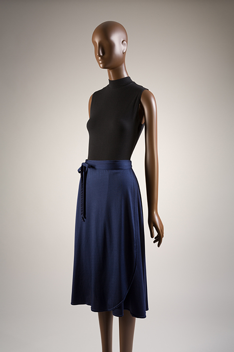 Bonnie August for Danskin, mock turtleneck cat suit and wrap skirt, circa 1985 and 1975, The Museum at FIT 2003.61.10 and 2003.61.2, Gift of Bonnie August. ©The Museum at FIT