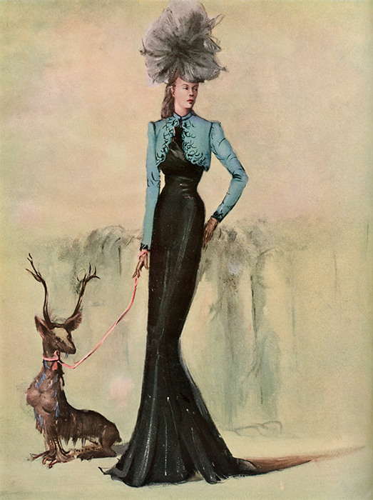 Lenore Fini, illustration of “Sleeping Blue” evening jacket by Elsa Schiaparelli, Harper’s Bazaar, March 15, 1940.