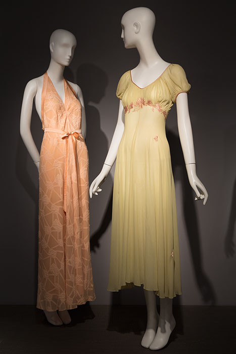 Halter-neck gowns became fashionable during the 1930s. Although a revealing neckline was most commonly used for evening dresses and swimsuits, it was also well-suited to intimate apparel. The intricately woven silk used to make this example has a “patchwork” pattern, providing texture and visual interest without interrupting the gown’s streamlined silhouette.