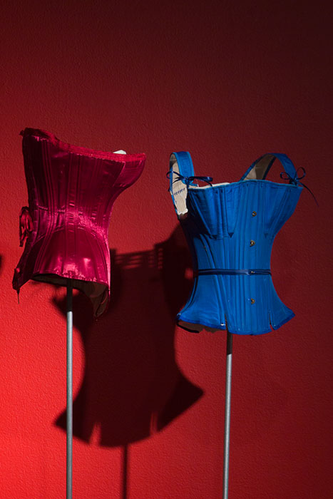 Left: Warner Bros. corset, red silk satin, Coraline, circa 1889, USA, 2009.15.2, museum purchase