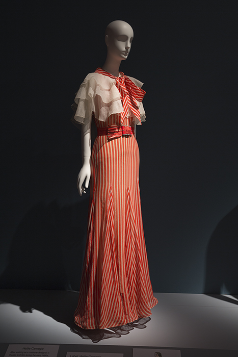 After working as a costume designer in theater and film during the early 1920s, Norell seamlessly transitioned into clothing design as a designer for a wholesale manufacturer. But his career took a quantum leap in 1928 when he went to work for Hattie Carnegie, owner of one of the leading fashion houses in New York and an elite purveyor of licensed copies of Parisian haute couture. Norell learned much during his twelve-year tenure under the formidable Carnegie. The mitered, candy-striped dress seen here is a rare surviving example of Norell’s early work.